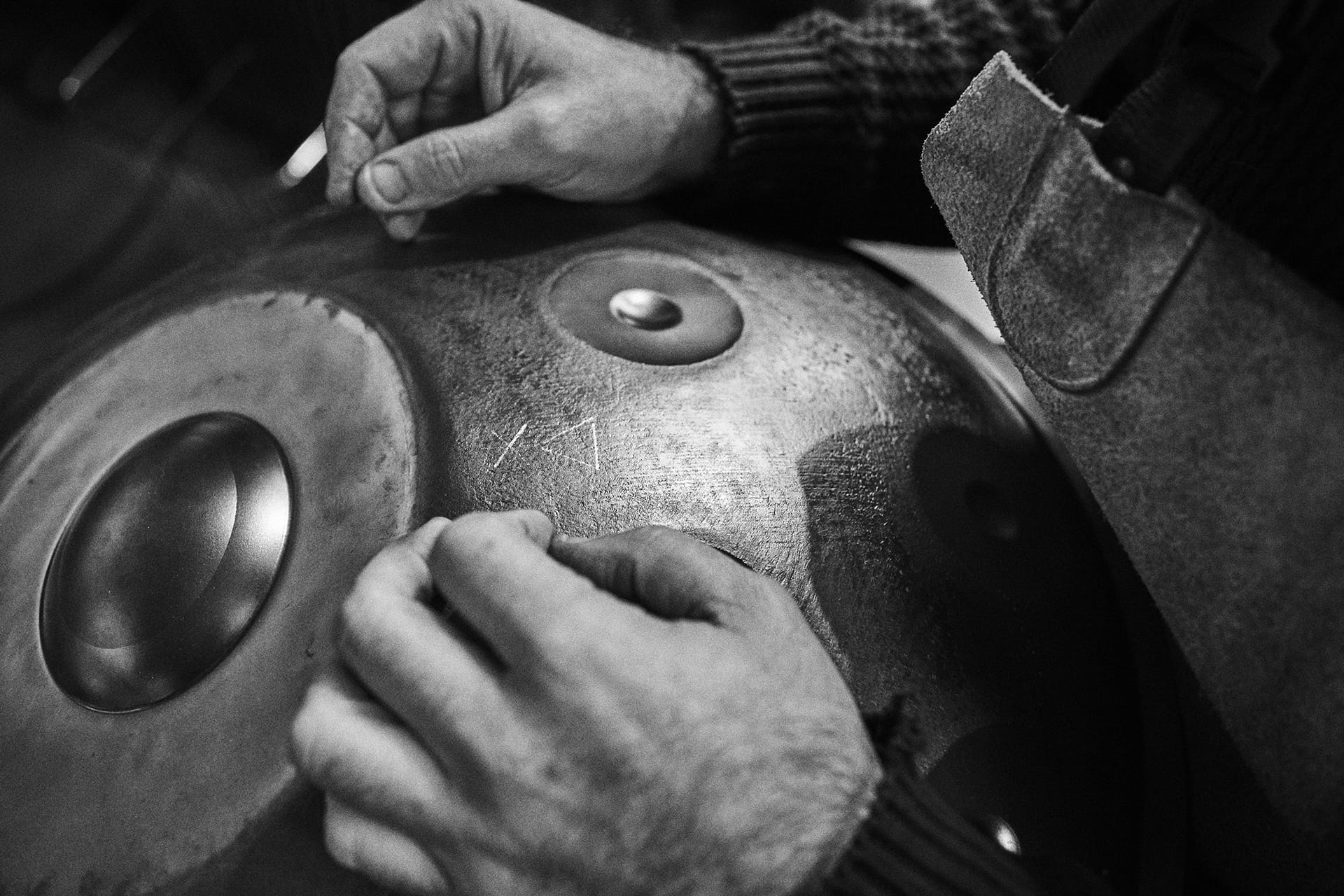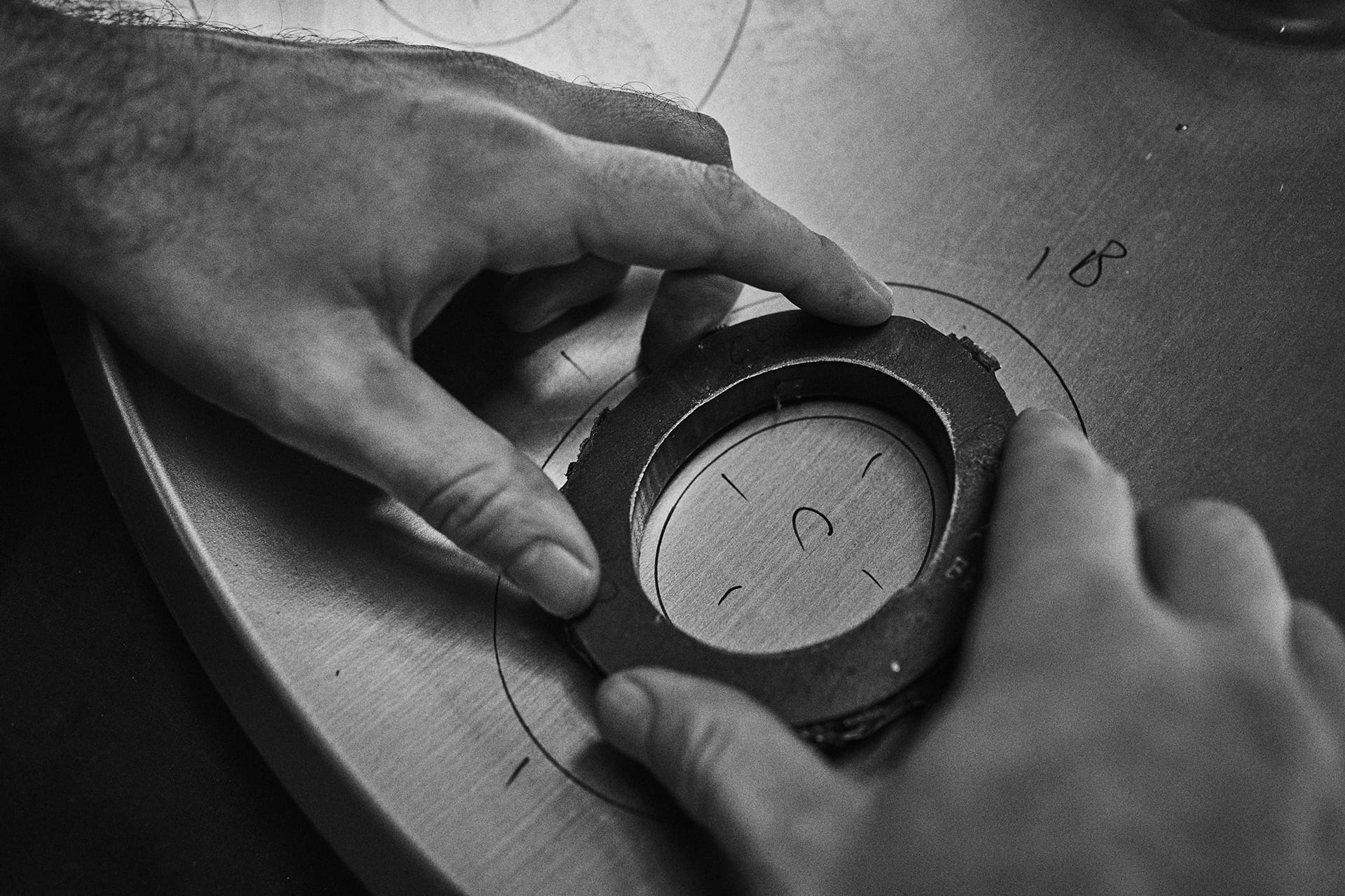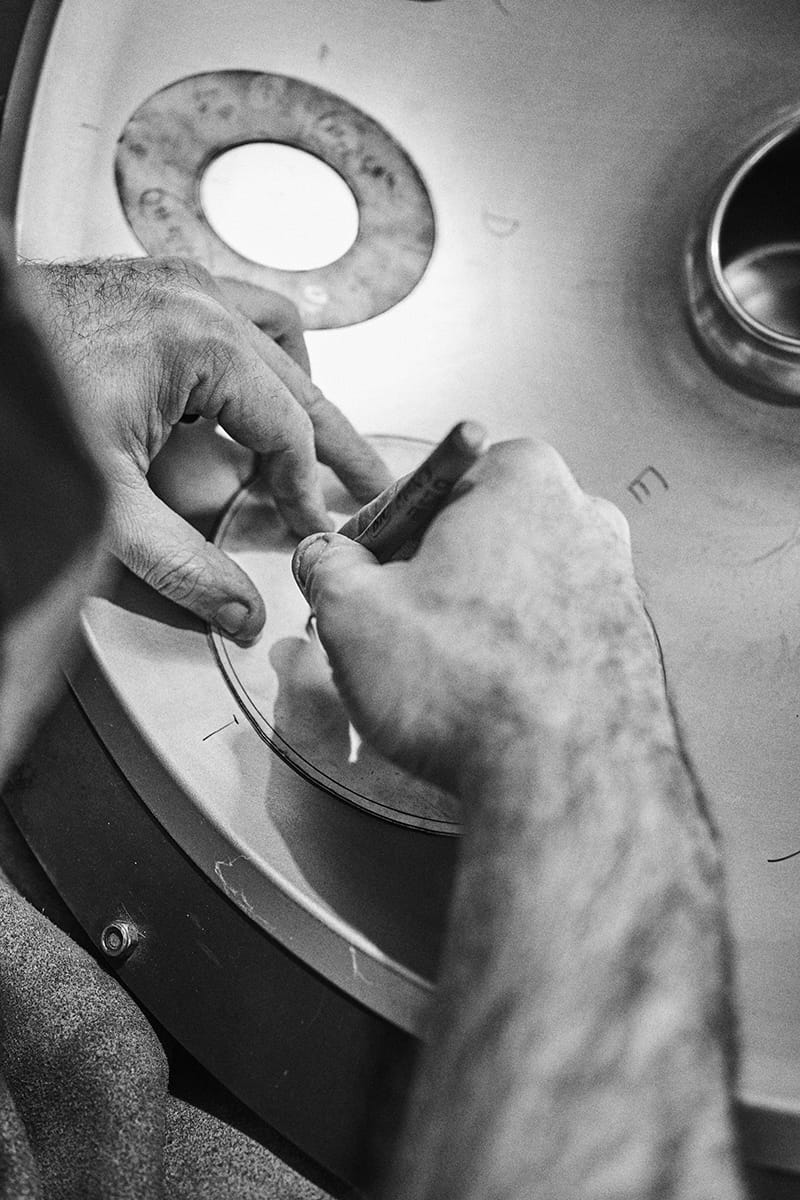 The creation of a handpan at Tiznajo Instruments begins with the meticulous drawing of the note positions, which vary with each model. The instrument is then shaped using molds, presses, and hammers, both manual and pneumatic. Afterwards, I alternate between tempering phases and hand tuning to ensure that the instrument maintains its tonal stability over time. Many of the tools I use are ones I have built myself, which allows me to adapt and continuously refine each stage of the process.